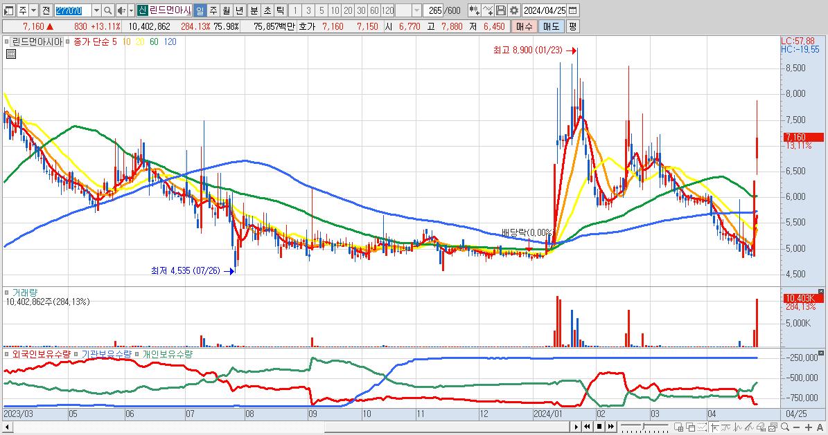 - 린드먼아시아 (7,160원 ▲ 13.11% , 시총: 980억, 거래량: 10,402,862, 거래대금:759억)