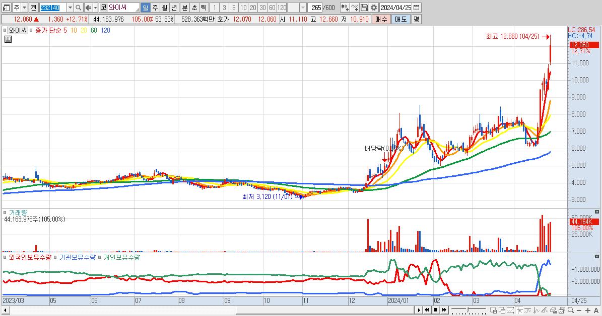 - 와이씨 (12,060원 ▲ 12.71% , 시총: 9,895억, 거래량: 44,163,976, 거래대금:5,284억)