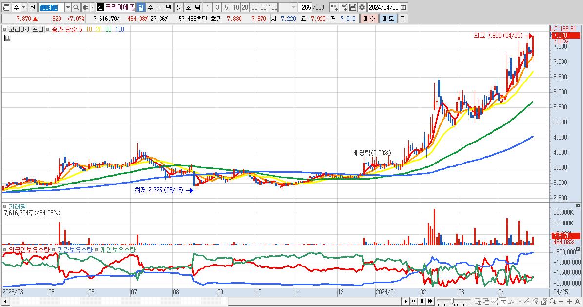 - 코리아에프티 (7,870원 ▲ 7.07% , 시총: 2,191억, 거래량: 7,616,704, 거래대금:575억)