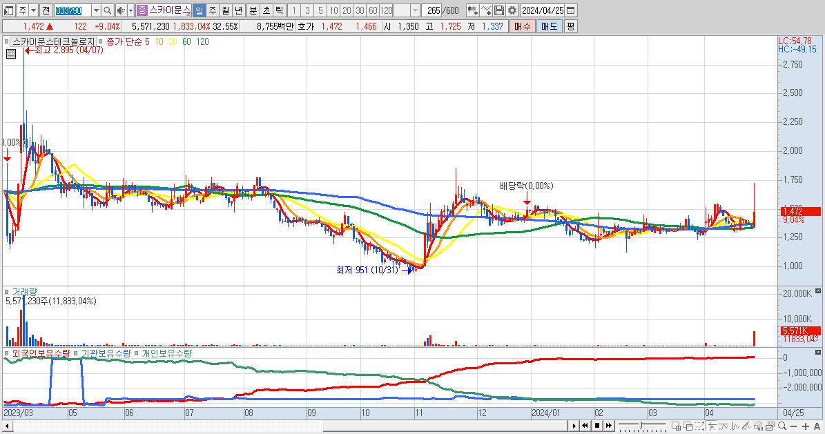 - 스카이문스테크놀로지 (1,472원 ▲ 9.04% , 시총: 252억, 거래량: 5,571,230, 거래대금:88억)