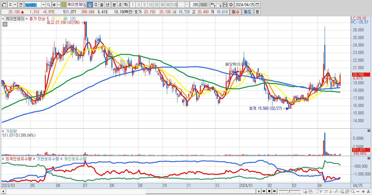 - 케이엔제이 (20,100원 ▲ 6.97% , 시총: 1,603억, 거래량: 511,071, 거래대금:102억)
