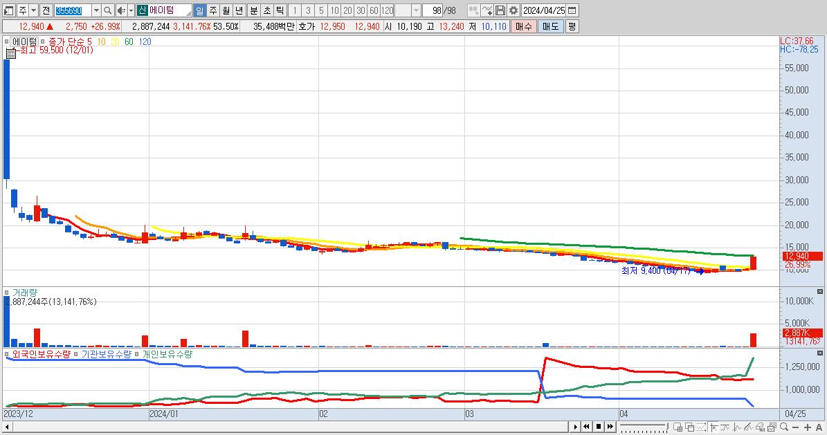 - 에이텀 (12,940원 ▲ 26.99% , 시총: 698억, 거래량: 2,887,244, 거래대금:355억)
