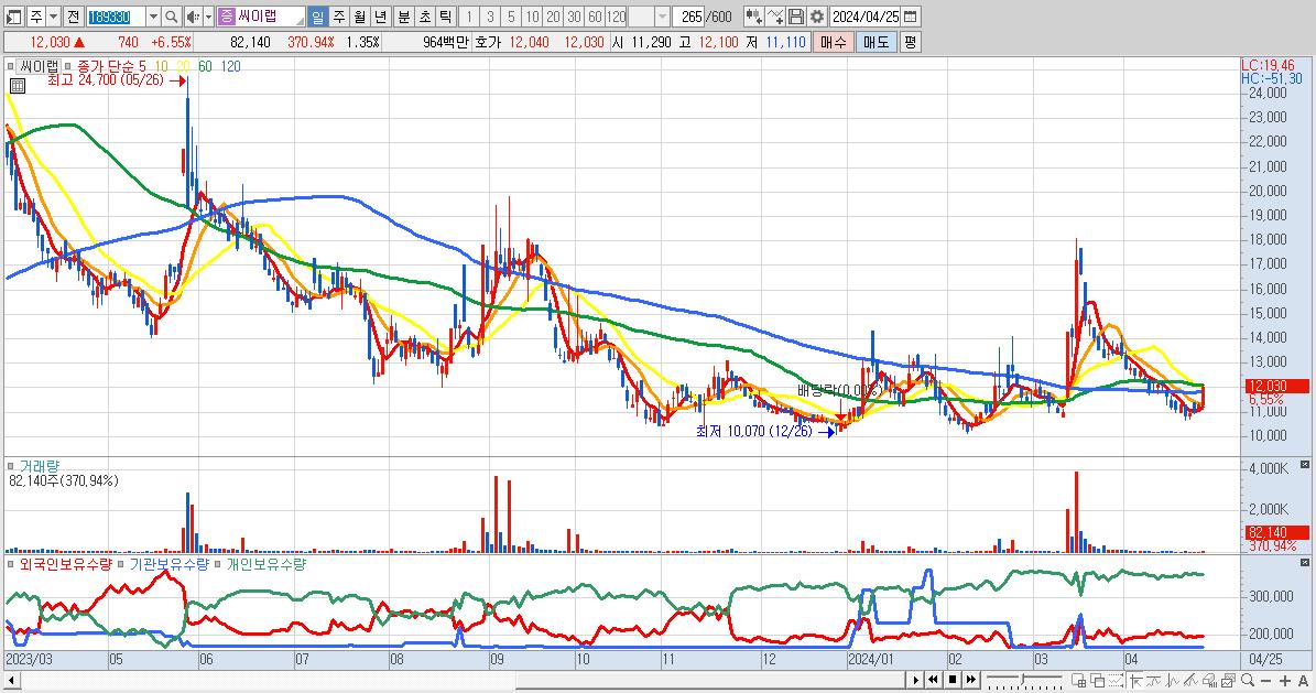 - 씨이랩 (12,030원 ▲ 6.55% , 시총: 733억, 거래량: 82,140, 거래대금:10억)