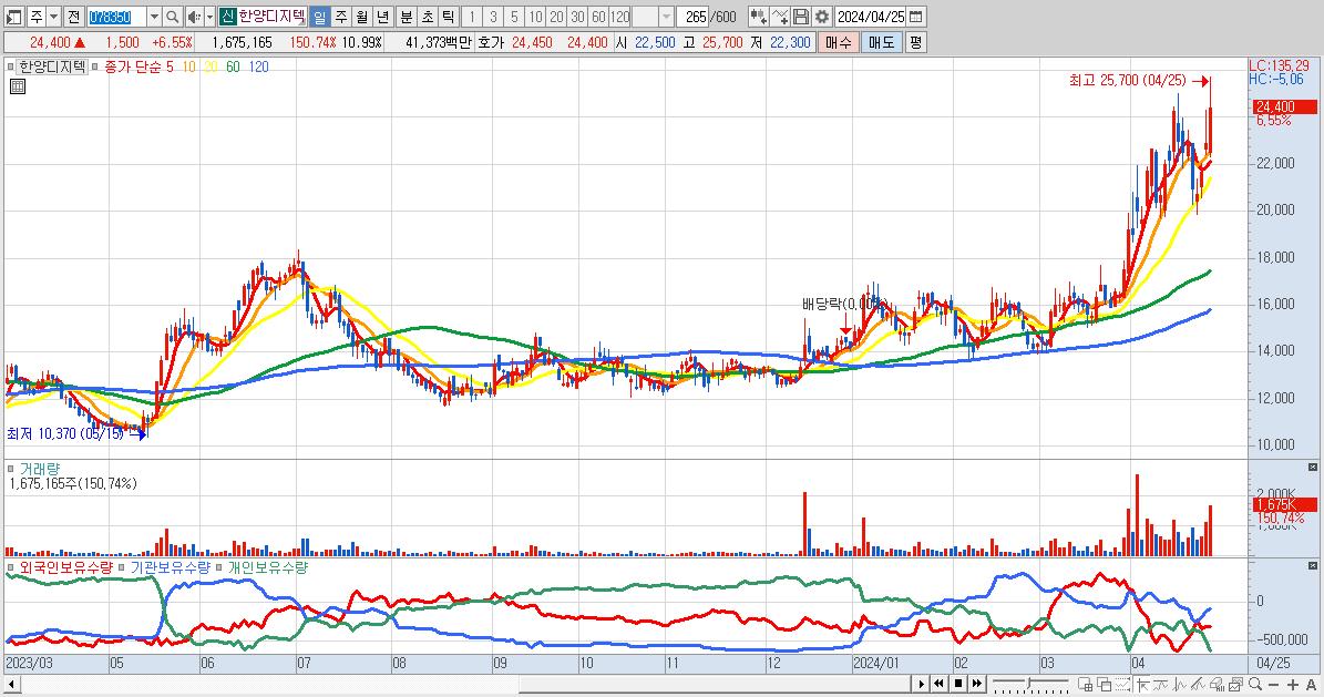 - 한양디지텍 (24,400원 ▲ 6.55% , 시총: 3,720억, 거래량: 1,675,165, 거래대금:414억)