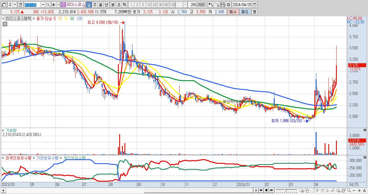 - 리더스코스메틱 (3,125원 ▲ 13.02% , 시총: 597억, 거래량: 2,210,814, 거래대금:72억)