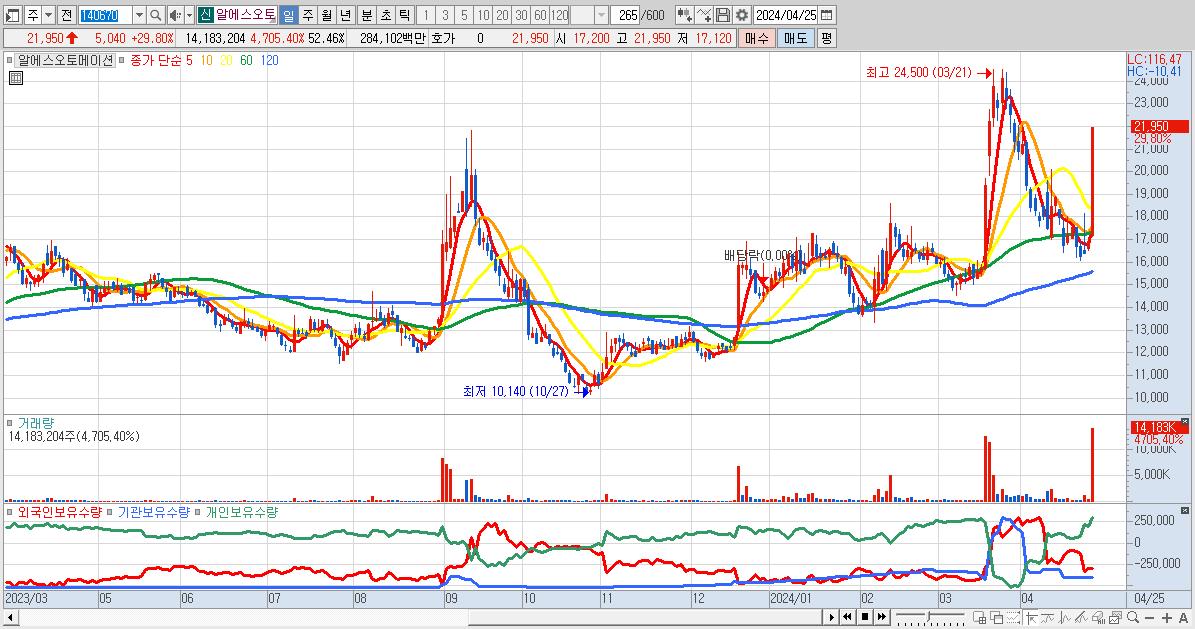 - 알에스오토메이션 (21,950원 ▲ 29.8% , 시총: 2,042억, 거래량: 14,183,204, 거래대금:2,841억)