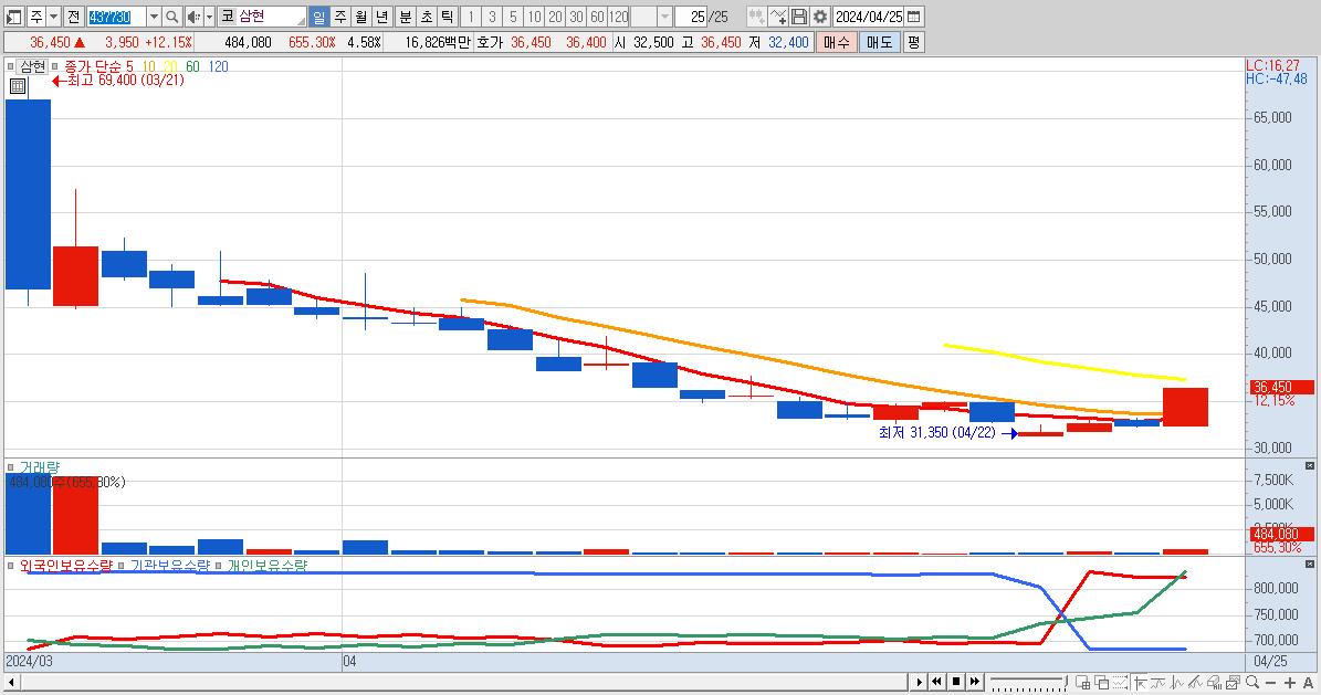 - 삼현 (36,450원 ▲ 12.15% , 시총: 3,852억, 거래량: 484,080, 거래대금:168억)