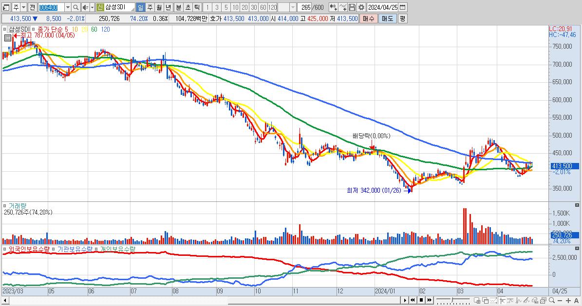 - 삼성SDI (413,500원 ▼ -2.01% , 시총: 284,341억, 외국인 순매수 거래금:39억)