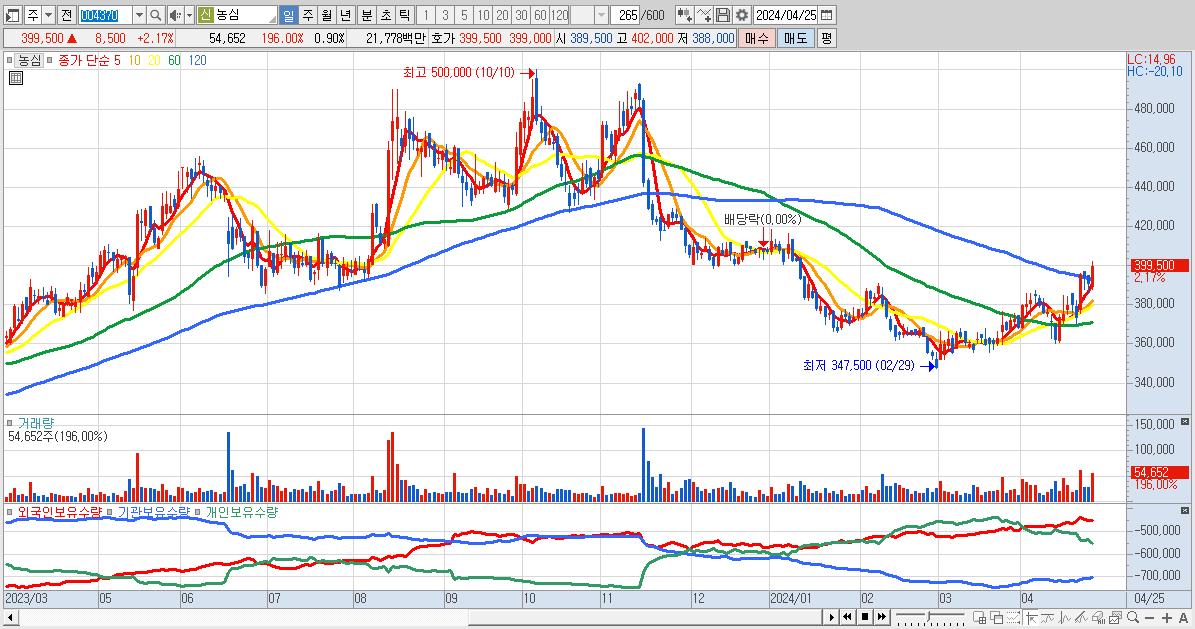 - 농심 (399,500원 ▲ 2.17% , 시총: 24,300억, 외국인 순매수 거래금:55억)
