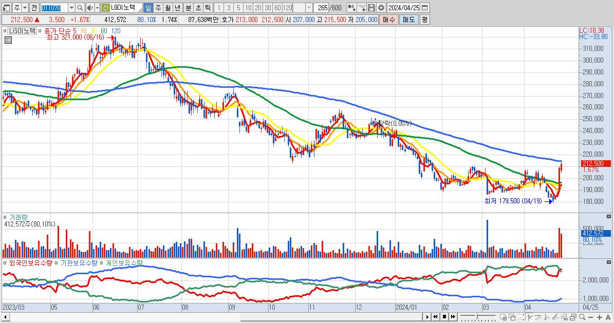 - LG이노텍 (212,500원 ▲ 1.67% , 시총: 50,293억, 외국인 순매수 거래금:167억)