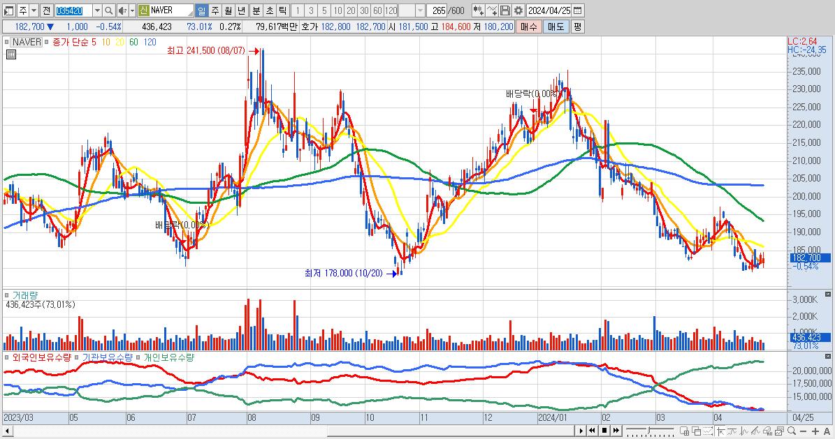 - NAVER (182,700원 ▼ -0.54% , 시총: 296,721억, 외국인 순매수 거래금:65억)
