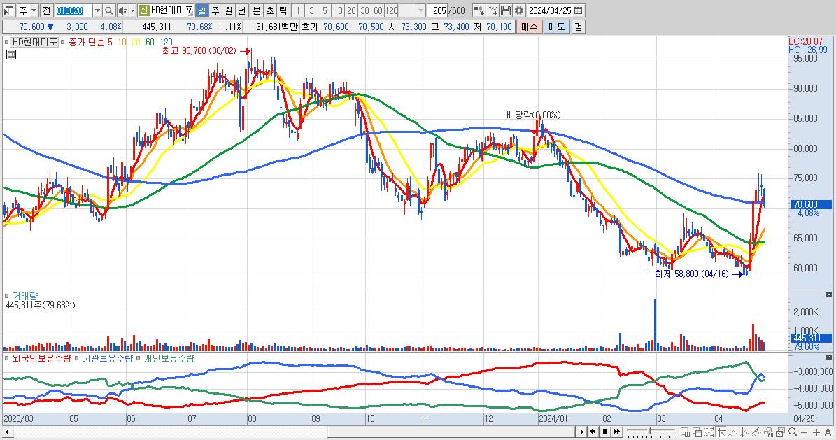 - HD현대미포 (70,600원 ▼ -4.08% , 시총: 28,199억, 외국인 순매수 거래금:57억)