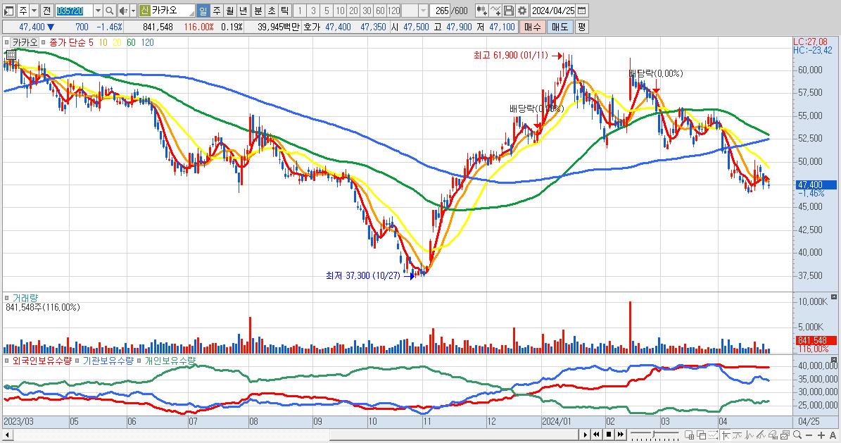 - 카카오 (47,400원 ▼ -1.46% , 시총: 211,046억, 외국인 순매수 거래금:42억)