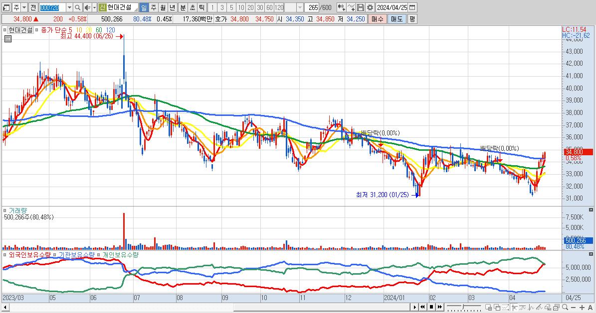 - 현대건설 (34,800원 ▲ 0.58% , 시총: 38,752억, 외국인 순매수 거래금:92억)