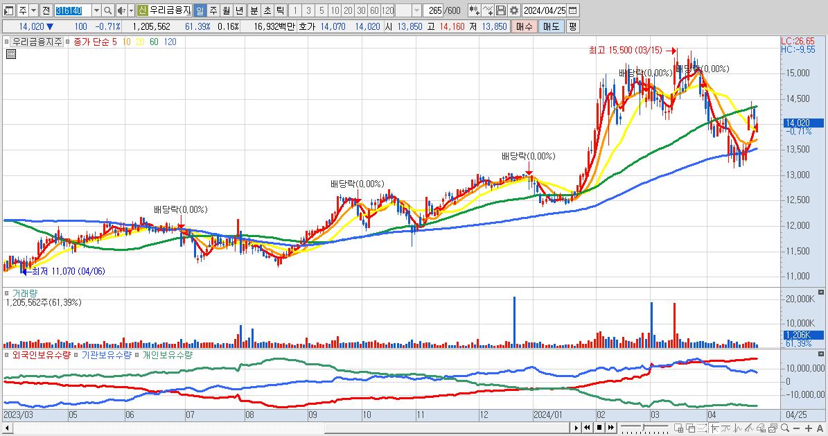 - 우리금융지주 (14,020원 ▼ -0.71% , 시총: 104,111억, 외국인 순매수 거래금:34억)