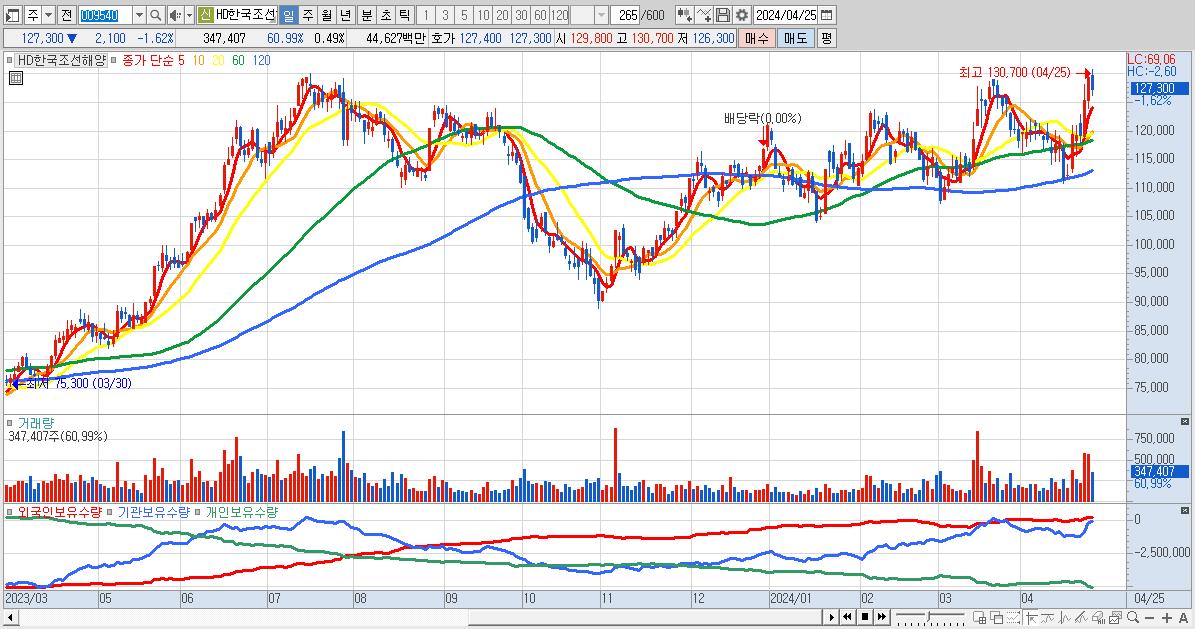 - HD한국조선해양 (127,300원 ▼ -1.62% , 시총: 90,094억, 외국인 순매수 거래금:53억)