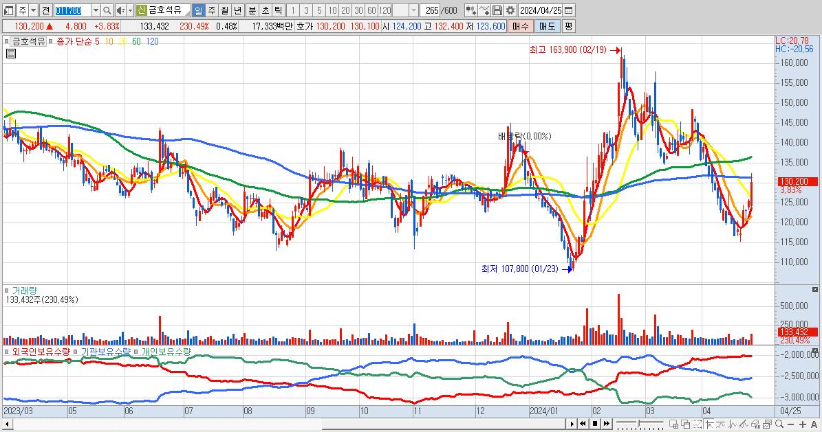 - 금호석유 (130,200원 ▲ 3.83% , 시총: 36,030억, 외국인 순매수 거래금:66억)