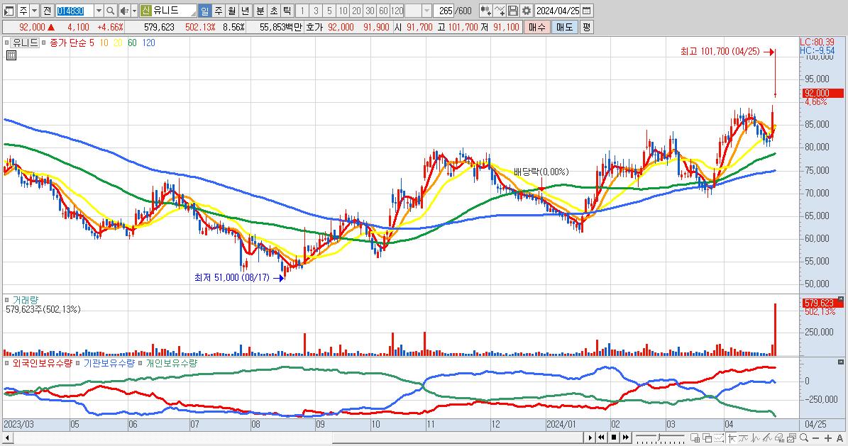 - 유니드 (92,000원 ▲ 4.66% , 시총: 6,226억, 외국인 순매수 거래금:72억)