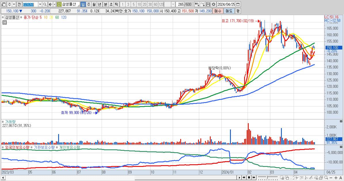 - 삼성물산 (150,100원 ▼ -0.2% , 시총: 278,573억, 외국인 순매수 거래금:63억)