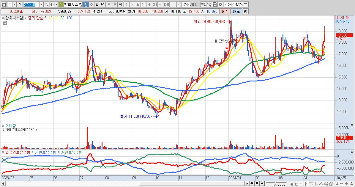 - 한화시스템 (18,620원 ▲ 2.82% , 시총: 35,177억, 외국인 순매수 거래금:152억)