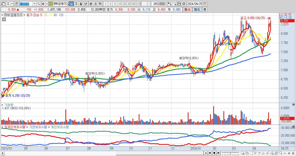 - BNK금융지주 (8,350원 ▲ 1.83% , 시총: 26,894억, 외국인 순매수 거래금:60억)