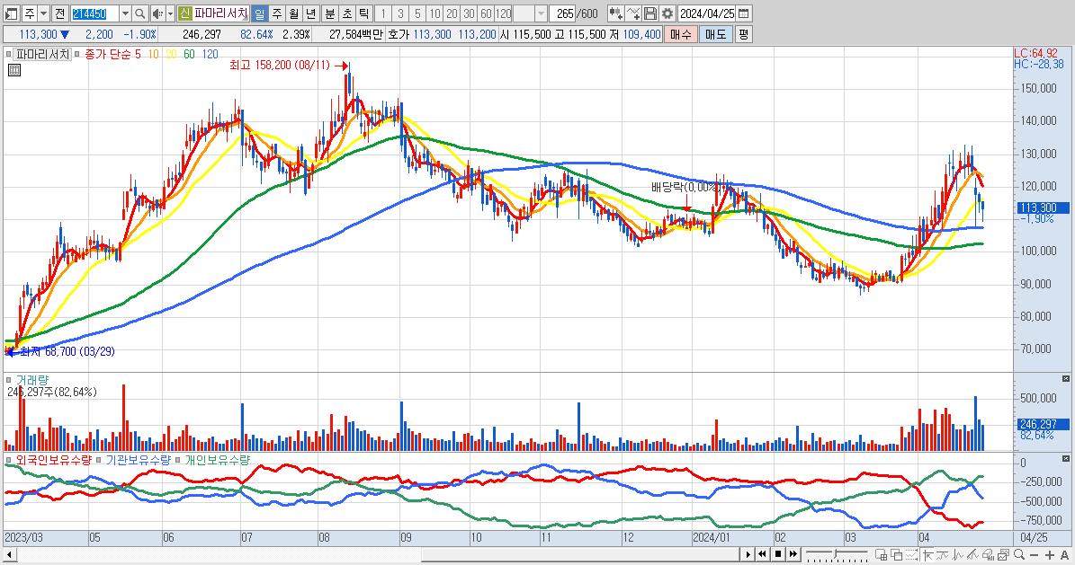 - 파마리서치 (113,300원 ▼ -1.9% , 시총: 11,693억, 외국인 순매수 거래금:43억)