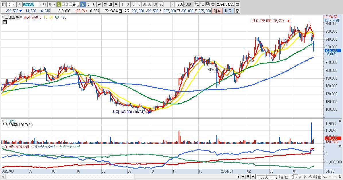 - 크래프톤 (225,500원 ▼ -6.04% , 시총: 109,062억, 외국인 순매수 거래금:36억)