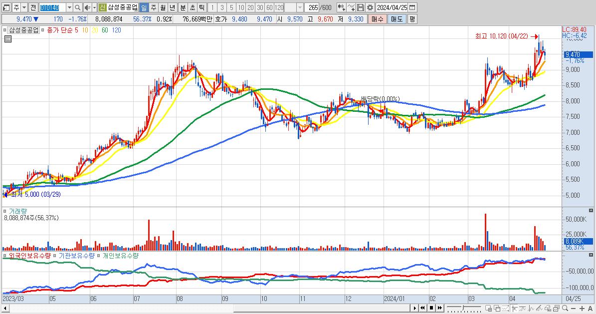 - 삼성중공업 (9,470원 ▼ -1.76% , 시총: 83,336억, 외국인 순매수 거래금:41억)
