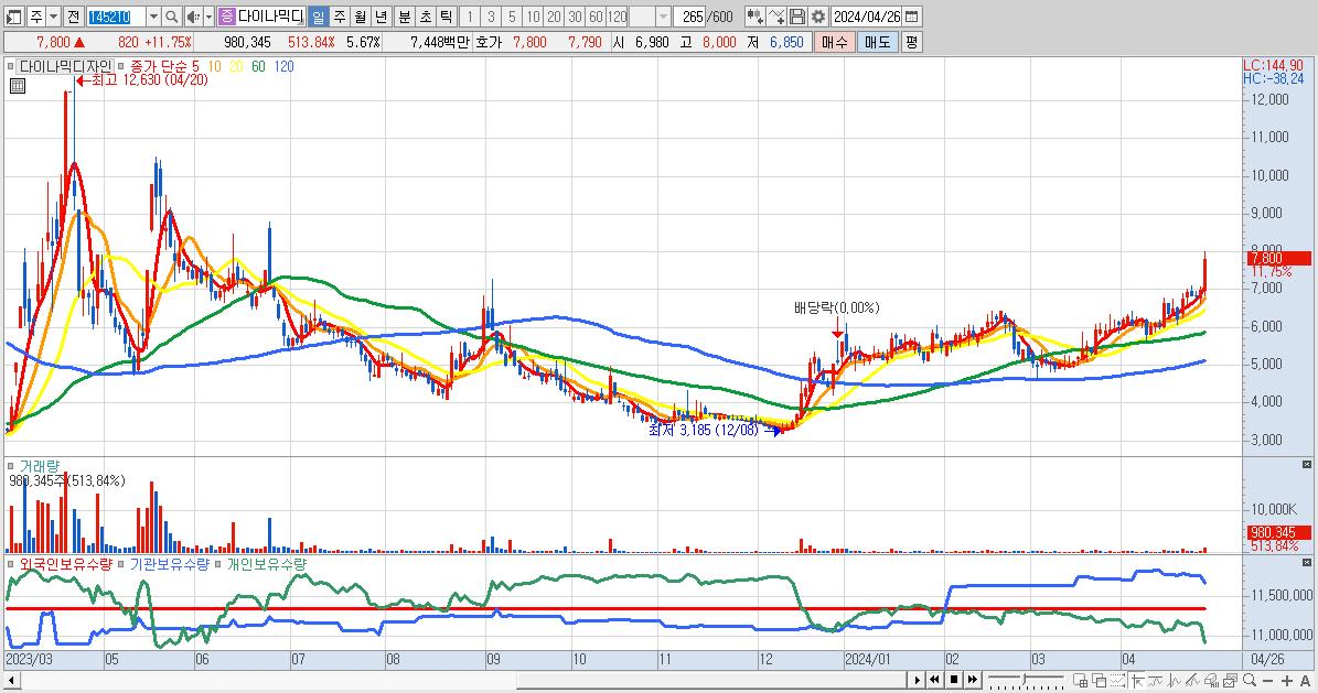 - 다이나믹디자인 (7,800원 ▲ 11.75% , 시총: 1,349억, 거래량: 980,345, 거래대금:74억)