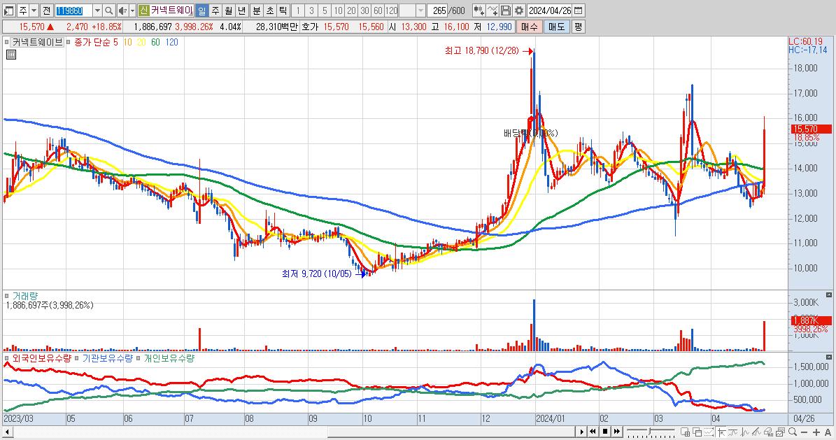 - 커넥트웨이브 (15,570원 ▲ 18.85% , 시총: 7,279억, 거래량: 1,886,697, 거래대금:283억)