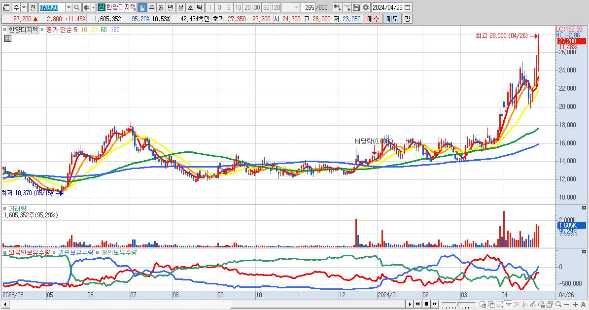 - 한양디지텍 (27,200원 ▲ 11.48% , 시총: 4,146억, 거래량: 1,605,352, 거래대금:424억)