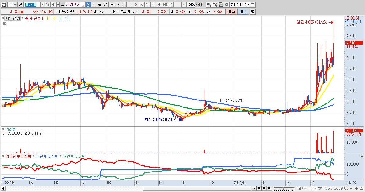 - 세명전기 (4,340원 ▲ 14.06% , 시총: 662억, 거래량: 21,553,699, 거래대금:969억)