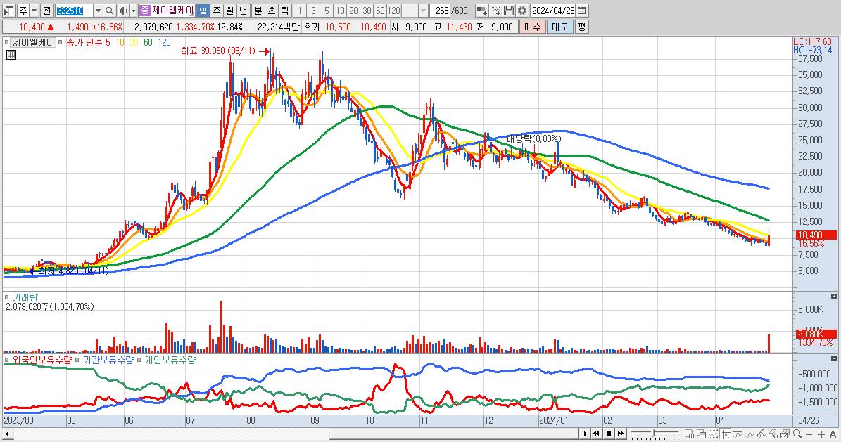 - 제이엘케이 (10,490원 ▲ 16.56% , 시총: 1,699억, 거래량: 2,079,620, 거래대금:222억)