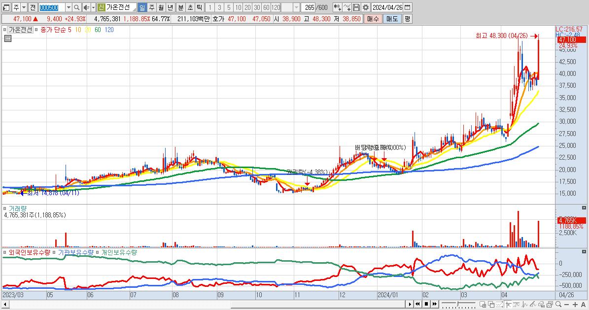 - 가온전선 (47,100원 ▲ 24.93% , 시총: 3,466억, 거래량: 4,765,381, 거래대금:2,111억)
