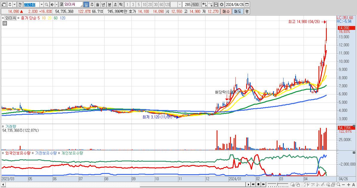 - 와이씨 (14,090원 ▲ 16.83% , 시총: 11,560억, 거래량: 54,735,368, 거래대금:7,460억)