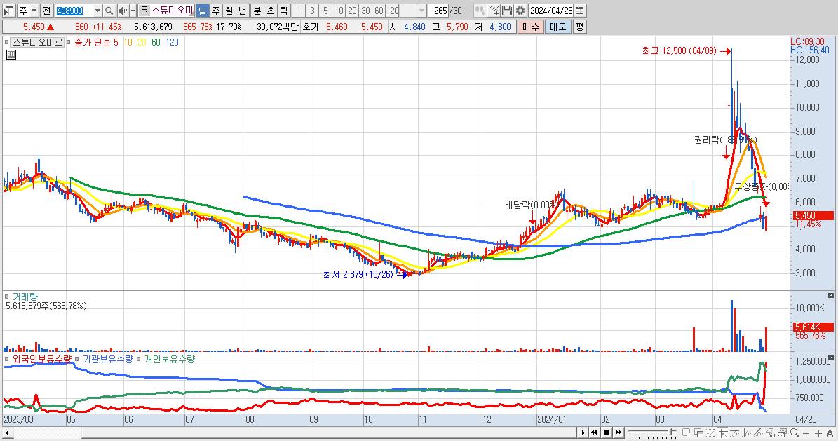 - 스튜디오미르 (5,450원 ▲ 11.45% , 시총: 1,720억, 거래량: 5,613,679, 거래대금:301억)