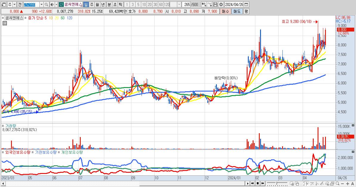 - 샘씨엔에스 (8,800원 ▲ 12.68% , 시총: 4,655억, 거래량: 8,067,278, 거래대금:694억)