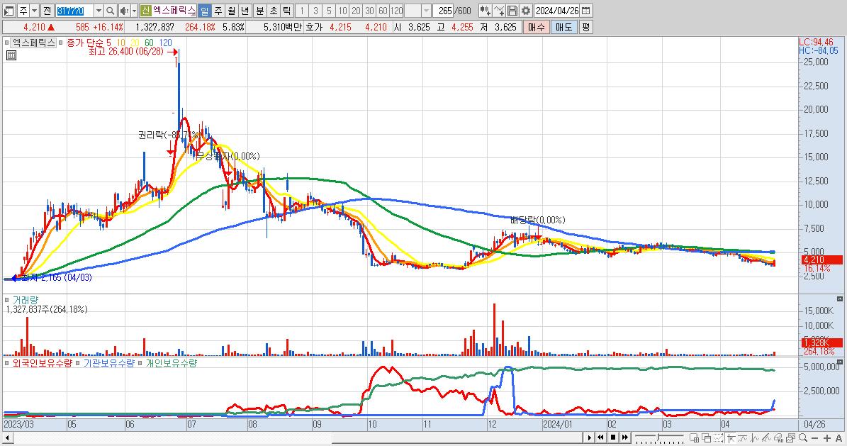 - 엑스페릭스 (4,210원 ▲ 16.14% , 시총: 959억, 거래량: 1,327,837, 거래대금:53억)