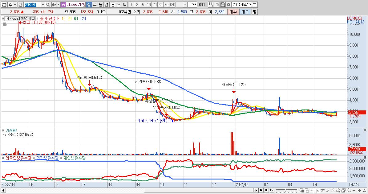 - 에스씨엠생명과학 (2,895원 ▲ 11.78% , 시총: 593억, 거래량: 37,998, 거래대금:1억)