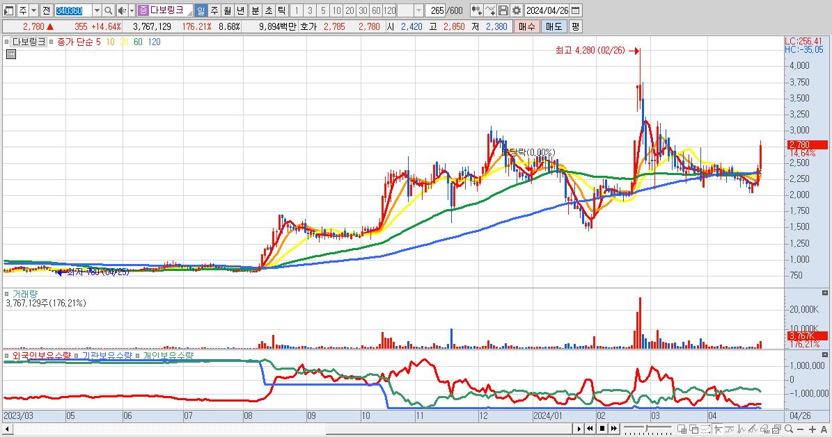 - 다보링크 (2,780원 ▲ 14.64% , 시총: 1,206억, 거래량: 3,767,129, 거래대금:99억)