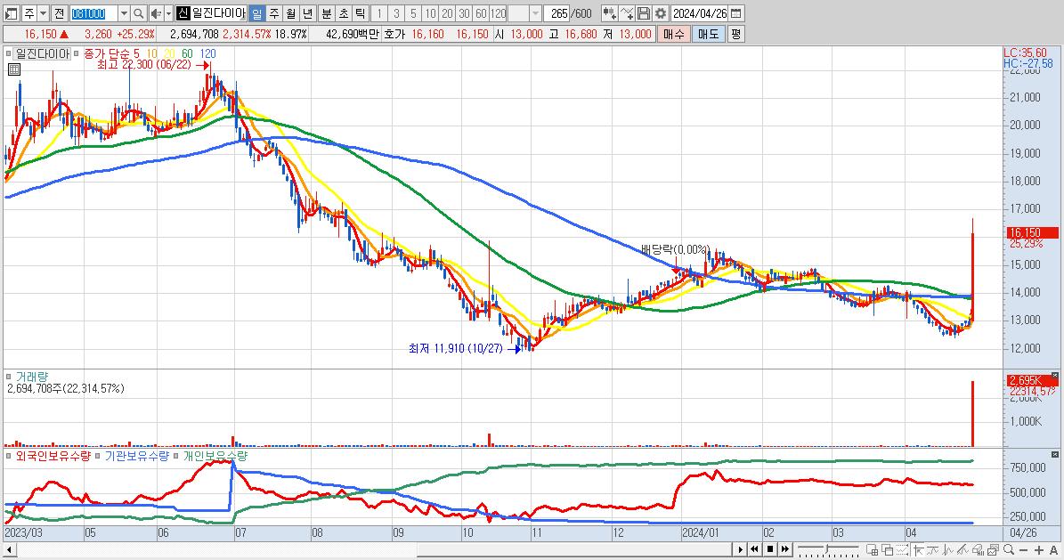 - 일진다이아 (16,150원 ▲ 25.29% , 시총: 2,294억, 거래량: 2,694,708, 거래대금:427억)