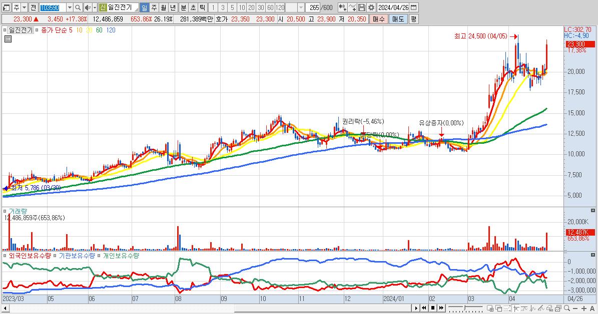 - 일진전기 (23,300원 ▲ 17.38% , 시총: 11,111억, 거래량: 12,486,859, 거래대금:2,814억)