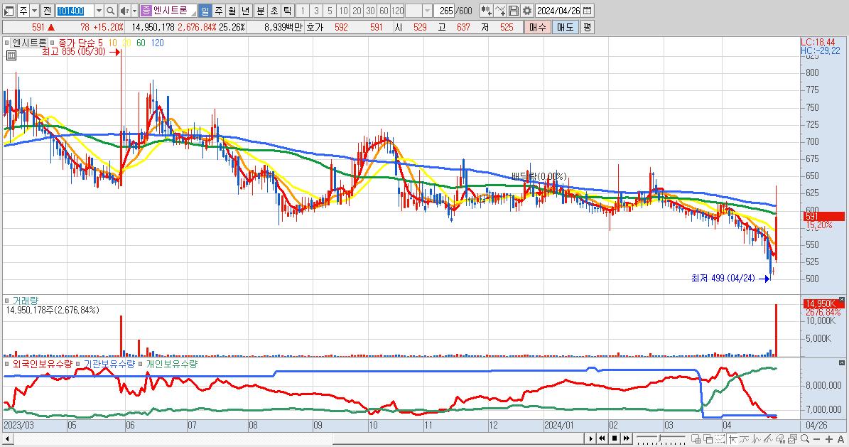 - 엔시트론 (591원 ▲ 15.2% , 시총: 350억, 거래량: 14,950,178, 거래대금:89억)