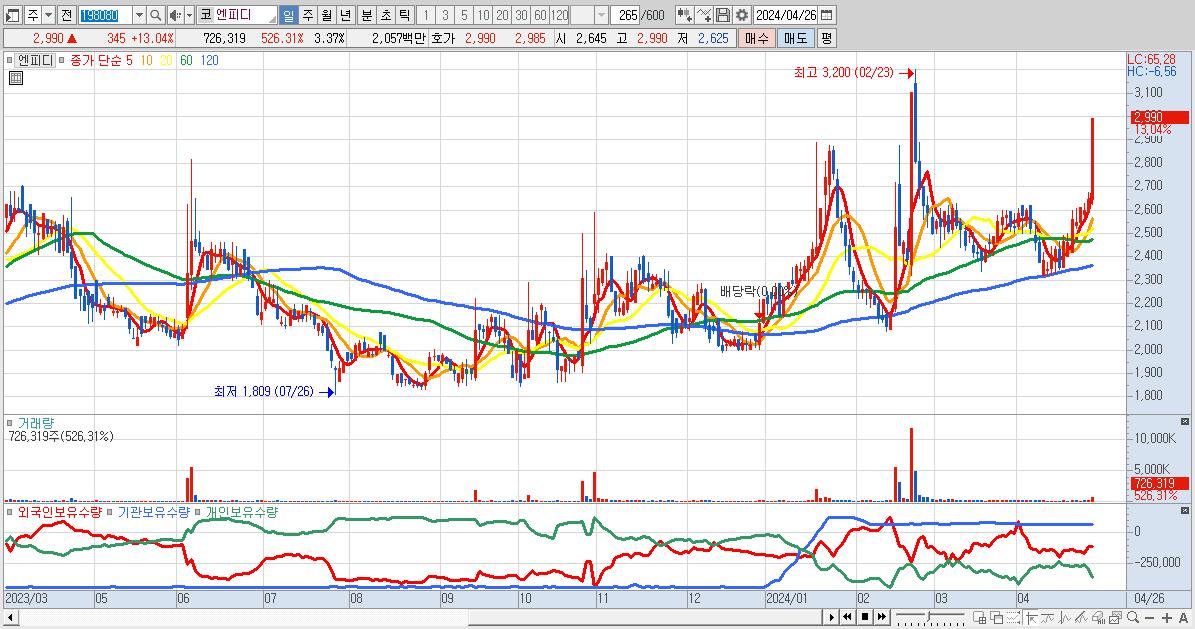 - 엔피디 (2,990원 ▲ 13.04% , 시총: 644억, 거래량: 726,319, 거래대금:21억)