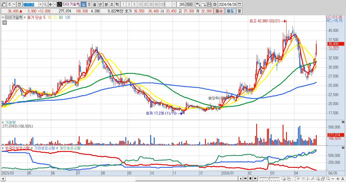 - 타이거일렉 (36,400원 ▲ 12% , 시총: 2,298억, 거래량: 312,074, 거래대금:110억)