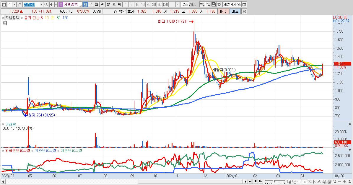 - 지엘팜텍 (1,320원 ▲ 11.39% , 시총: 1,012억, 거래량: 603,148, 거래대금:8억)