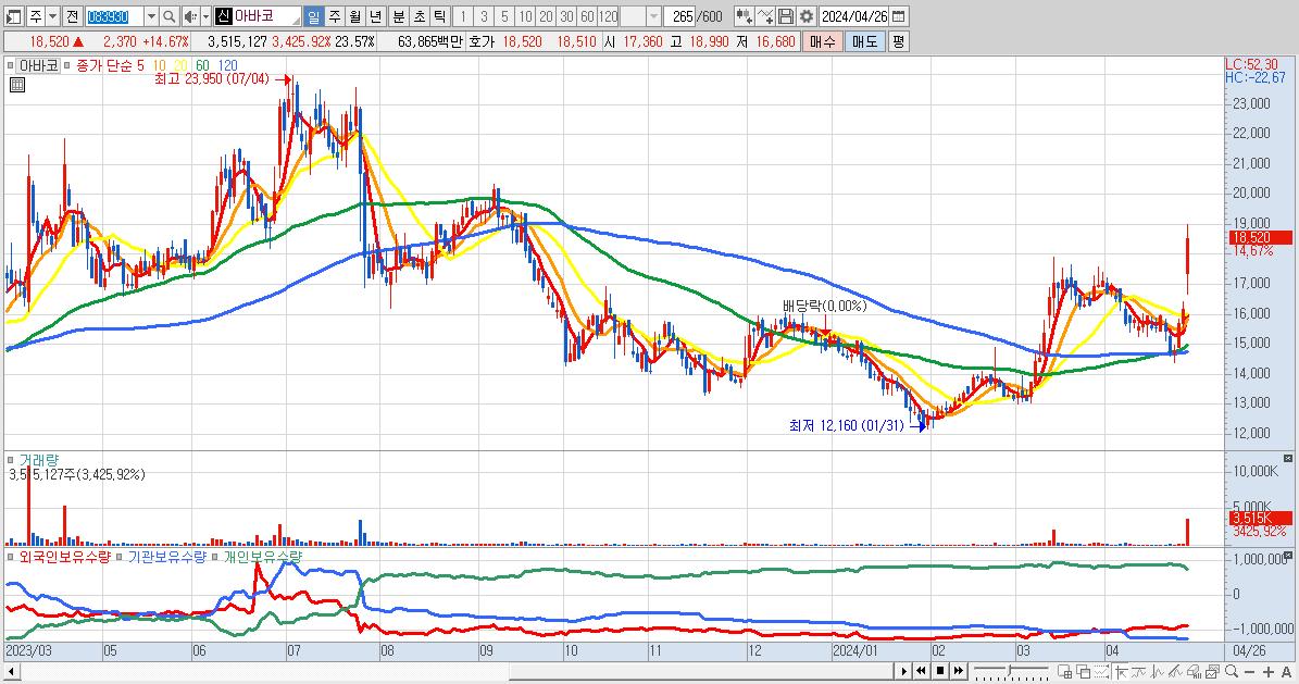 - 아바코 (18,520원 ▲ 14.67% , 시총: 2,762억, 거래량: 3,515,127, 거래대금:639억)