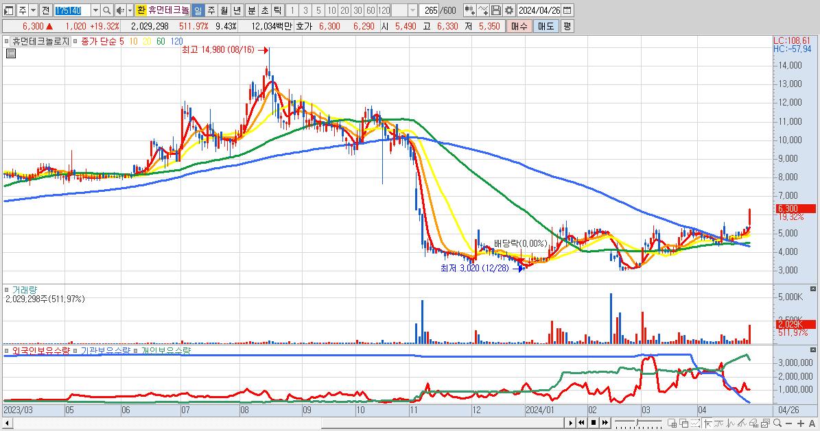 - 휴먼테크놀로지 (6,300원 ▲ 19.32% , 시총: 1,355억, 거래량: 2,029,298, 거래대금:120억)