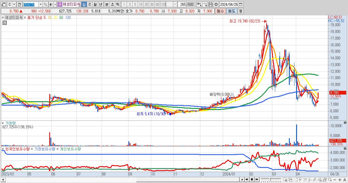- 해성티피씨 (8,780원 ▲ 12.56% , 시총: 948억, 거래량: 627,725, 거래대금:53억)