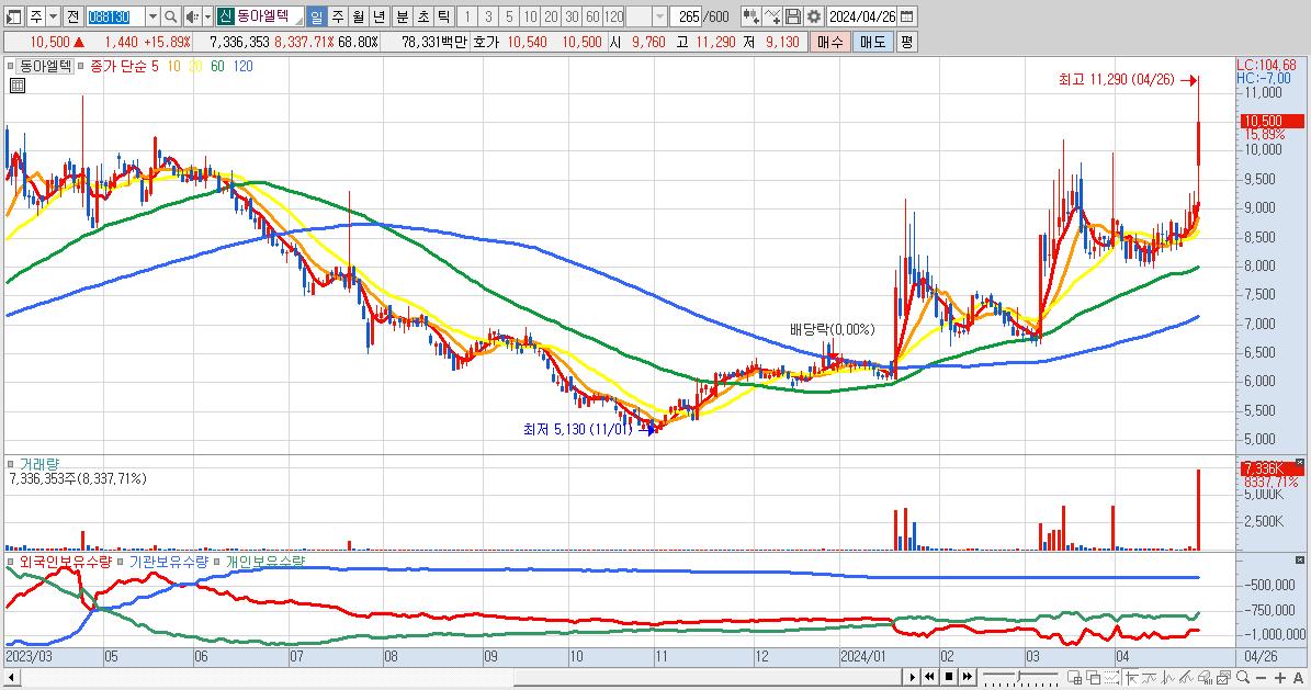 - 동아엘텍 (10,500원 ▲ 15.89% , 시총: 1,120억, 거래량: 7,336,353, 거래대금:783억)